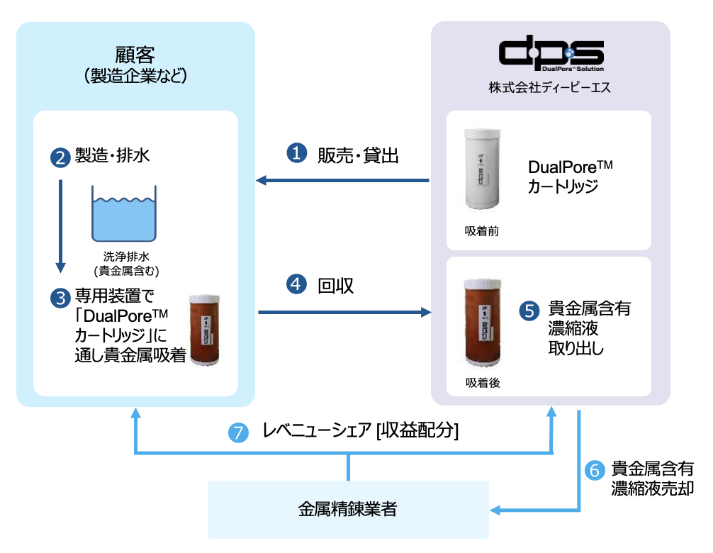 この技術を用いて、化学触媒製造や電子部品製造の工程で発生する廃液から、数ppmレベルのパラジウムなどの低濃度貴金属を効率的に回収することに成功しています。排水ラインにカートリッジを設置し、回収した貴金属を精錬業者へ販売、収益を顧客企業とシェアするビジネスモデルを展開(図2)。すでに複数のお客様に導入されています。